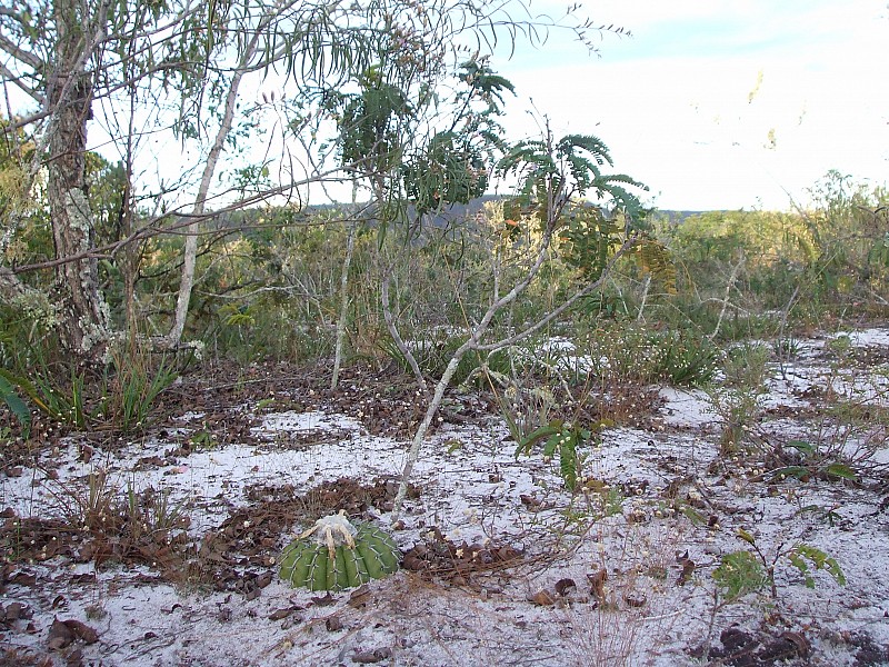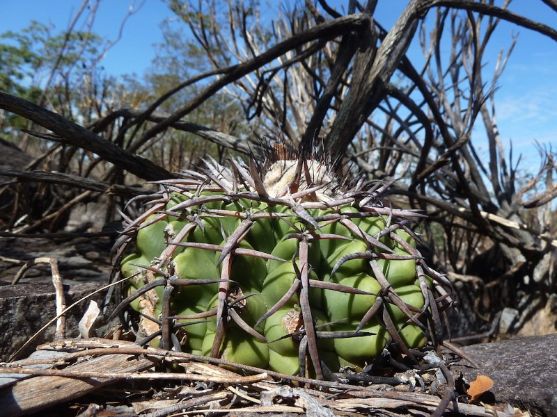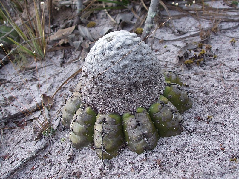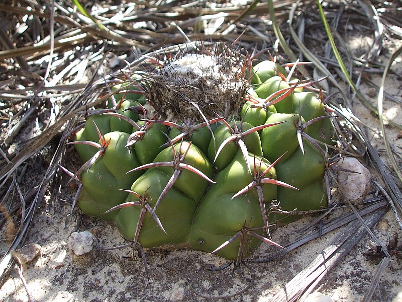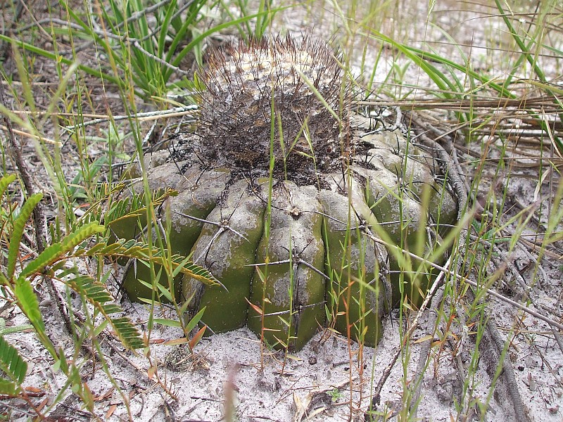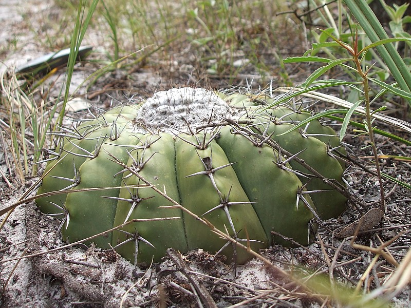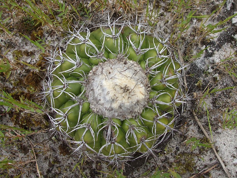 Taylor & Zappi riassumendo la loro posizione sul tema (Taylor 1981, 43: 40; Taylor & Zappi 1991, 9: 86) in Cacti of Eastern Brazil (2004, 449-450) affermano che Buining ha erroneamente identificato le piante trovate con il D. insignis di Pfeiffer, e che mentre quest’ultimo è correttamente da ritenersi un sinonimo di Discocactus placentiformis (Lehmann) K. Schumann, le prime siano invece un altro taxon, vale a dire il Discocactus pseudoinsignis N. P. Taylor & Zappi, da loro già pubblicato su Bradleya in sostituzione di D. insignis sensu Buining, ora sinonimo. Questo perché nella sua descrizione Pfeiffer parla di una pianta con 10 coste, mentre D. pseudoinsignis ne avrebbe solitamente 12-13, e inoltre l’illustrazione del tipo successivamente pubblicata da Pfeiffer (1839, 19 (1): tav. 15) indicherebbe un colore rosa scuro per scaglie-brattee del tubo fiorale e segmenti esterni del perianzio, caratteristica di alcune forme di D. placentiformis, mentre D. pseudoinsignis avrebbe segmenti esterni brunastro pallido-verde oliva. É da notare che la stessa illustrazione (considerata come preparata prima della pubblicazione del 1837) viene indicata dagli autori come lectotype di D. insignis Pfeiffer tra i sinonimi di D. placentiformis (2004, 447). Sul fatto che tra le popolazioni di Discocactus che attualmente vivono all’interno del P. E. de Grão Mogol non possano esservi esemplari con 10 coste, e soprattutto che la pianta illustrata da Pfeiffer (per altro con almeno 12 coste) non possa essere considerata un possibile campione di quelle che vivono a Grão Mogol, qualche dubbio ce l’avremmo. Inoltre i colori riportati da Buining per i segmenti esterni del perianzio del suo D. insignis (vedi più avanti), ben si confanno all’illustrazione di Pfeiffer. Ma quel che ci interessa rilevare non ha a che fare con la scelta tra D. insignis Pfeiffer o D. pseudoinsignis Taylor & Zappi, perché è nostro parere che siano sinonimi di D. placentiformis, in quanto tra questi non esiste in natura nessuna differenza rilevante, e che più semplicemente già Schumann nella pubblicazione del 1890 avesse ragione. Sia Buining (1980, 89) che Taylor & Zappi (2004, 449-450) parlando di D. insignis o D. pseudoinsignis, non possono fare a meno di notare quanto questo sia simile e compreso nell’areale del variabile D. placentiformis, e devono perciò specificare differenze che però vengono smentite ad una ad una dall’osservazione in habitat e dalla lettura delle fonti. Infatti Buining alla fine della sua esposizione di D. insignis dice genericamente che le differenze con D. placentiformis sono mostrate nella descrizione, riferendosi ai dati del corpo e del fiore della pianta, sottolineando la maggiore differenza sostanzialmente nella dimensione del seme; mentre Taylor & Zappi affermano che D. pseudoinsignis si distingue dall’altro taxon per le coste non tubercolate (solitamente in numero di 12-13), il colore dei boccioli e dei segmenti esterni del perianzio, l’apice del frutto e per finire la dimensione del seme. Andiamo ora a verificare quanto le caratteristiche del Discocactus di Grão Mogol siano realmente distinte da quelle delle altre popolazioni di D. placentiformis. Il materiale fotografico relativo a D. insignis / D. pseudoinsignis (foto 32-47) è stato rilevato all’interno del P. E. de Grão Mogol.