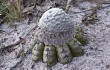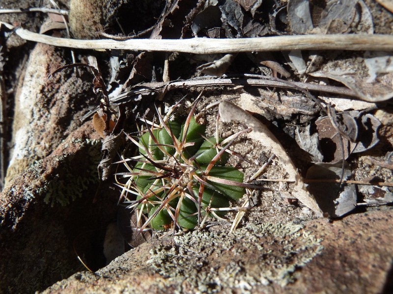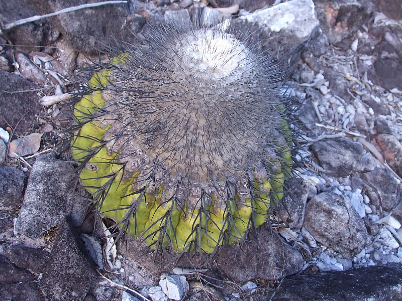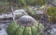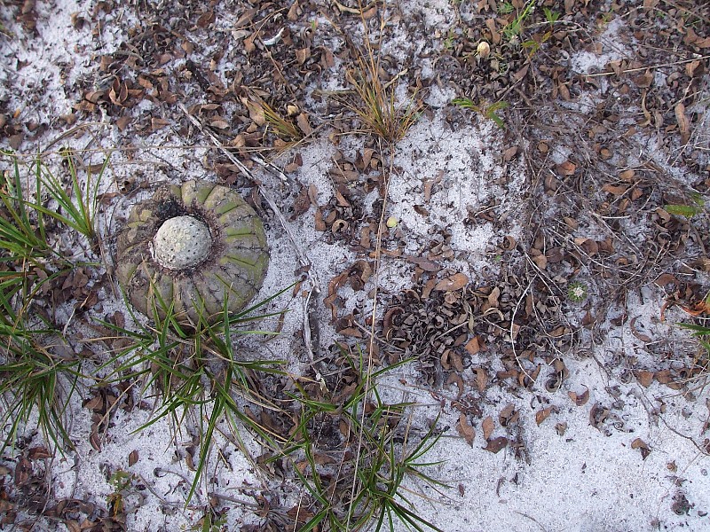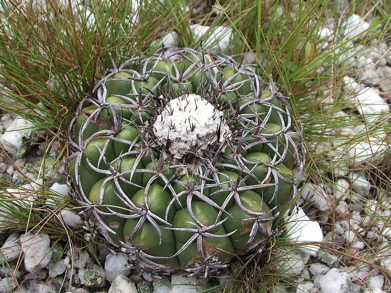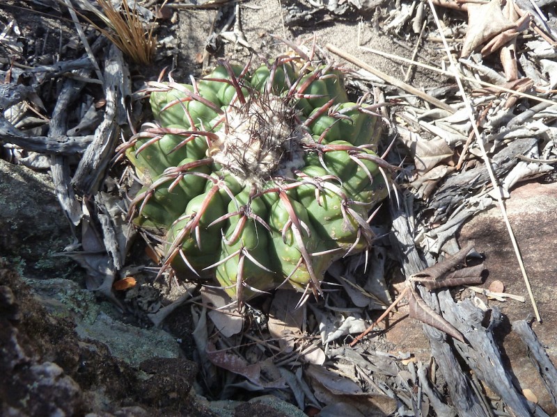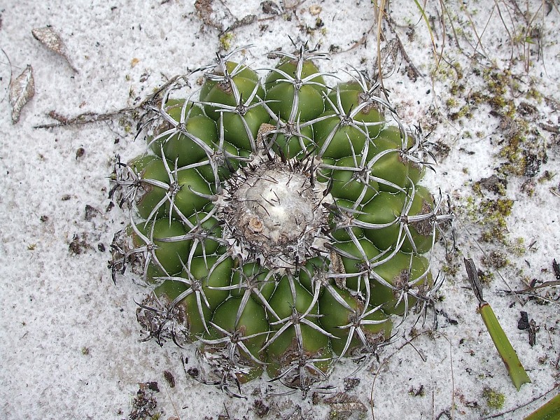 Taylor & Zappi riassumendo la loro posizione sul tema (Taylor 1981, 43: 40; Taylor & Zappi 1991, 9: 86) in Cacti of Eastern Brazil (2004, 449-450) affermano che Buining ha erroneamente identificato le piante trovate con il D. insignis di Pfeiffer, e che mentre quest’ultimo è correttamente da ritenersi un sinonimo di Discocactus placentiformis (Lehmann) K. Schumann, le prime siano invece un altro taxon, vale a dire il Discocactus pseudoinsignis N. P. Taylor & Zappi, da loro già pubblicato su Bradleya in sostituzione di D. insignis sensu Buining, ora sinonimo. Questo perché nella sua descrizione Pfeiffer parla di una pianta con 10 coste, mentre D. pseudoinsignis ne avrebbe solitamente 12-13, e inoltre l’illustrazione del tipo successivamente pubblicata da Pfeiffer (1839, 19 (1): tav. 15) indicherebbe un colore rosa scuro per scaglie-brattee del tubo fiorale e segmenti esterni del perianzio, caratteristica di alcune forme di D. placentiformis, mentre D. pseudoinsignis avrebbe segmenti esterni brunastro pallido-verde oliva. É da notare che la stessa illustrazione (considerata come preparata prima della pubblicazione del 1837) viene indicata dagli autori come lectotype di D. insignis Pfeiffer tra i sinonimi di D. placentiformis (2004, 447). Sul fatto che tra le popolazioni di Discocactus che attualmente vivono all’interno del P. E. de Grão Mogol non possano esservi esemplari con 10 coste, e soprattutto che la pianta illustrata da Pfeiffer (per altro con almeno 12 coste) non possa essere considerata un possibile campione di quelle che vivono a Grão Mogol, qualche dubbio ce l’avremmo. Inoltre i colori riportati da Buining per i segmenti esterni del perianzio del suo D. insignis (vedi più avanti), ben si confanno all’illustrazione di Pfeiffer. Ma quel che ci interessa rilevare non ha a che fare con la scelta tra D. insignis Pfeiffer o D. pseudoinsignis Taylor & Zappi, perché è nostro parere che siano sinonimi di D. placentiformis, in quanto tra questi non esiste in natura nessuna differenza rilevante, e che più semplicemente già Schumann nella pubblicazione del 1890 avesse ragione. Sia Buining (1980, 89) che Taylor & Zappi (2004, 449-450) parlando di D. insignis o D. pseudoinsignis, non possono fare a meno di notare quanto questo sia simile e compreso nell’areale del variabile D. placentiformis, e devono perciò specificare differenze che però vengono smentite ad una ad una dall’osservazione in habitat e dalla lettura delle fonti. Infatti Buining alla fine della sua esposizione di D. insignis dice genericamente che le differenze con D. placentiformis sono mostrate nella descrizione, riferendosi ai dati del corpo e del fiore della pianta, sottolineando la maggiore differenza sostanzialmente nella dimensione del seme; mentre Taylor & Zappi affermano che D. pseudoinsignis si distingue dall’altro taxon per le coste non tubercolate (solitamente in numero di 12-13), il colore dei boccioli e dei segmenti esterni del perianzio, l’apice del frutto e per finire la dimensione del seme. Andiamo ora a verificare quanto le caratteristiche del Discocactus di Grão Mogol siano realmente distinte da quelle delle altre popolazioni di D. placentiformis. Il materiale fotografico relativo a D. insignis / D. pseudoinsignis (foto 32-47) è stato rilevato all’interno del P. E. de Grão Mogol.