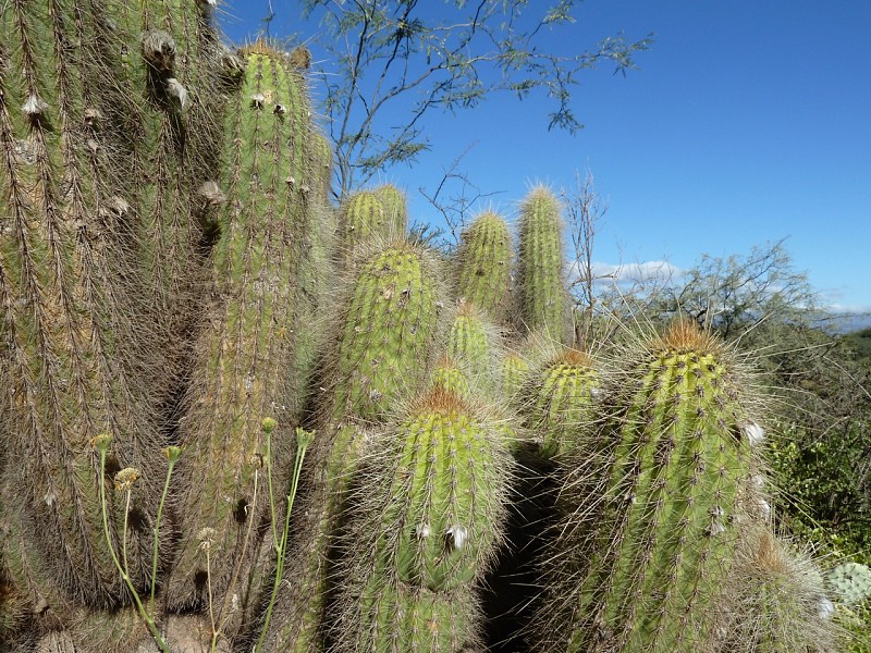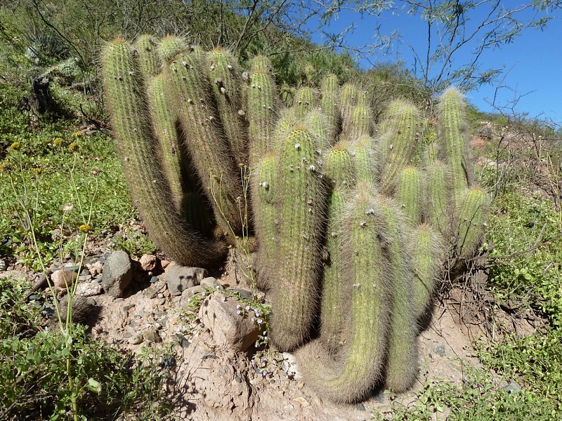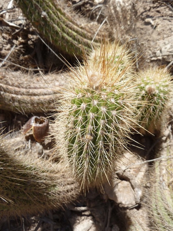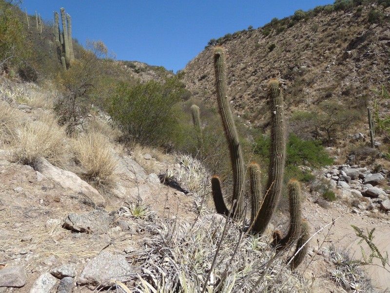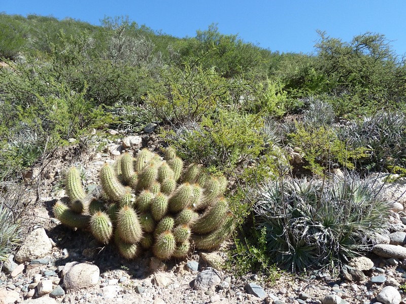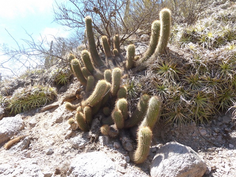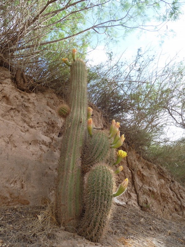 Nelle popolazioni di Echinopsis huascha (F. A. C. Weber) H. Friedrich & G. D. Rowley che in Argentina, nella provincia di Catamarca vanno da Belén a Hualfín, si può rilevare che la forma nota come Echinopsis huascha ssp. robusta (Rausch) Lowry (Lowry 2002, 14: 14) non è distinta dalla forma tipo, le popolazioni della quale assumono gradatamente dimensioni maggiori, procedendo verso nord. Nella zona di Hualfín, località del tipo di Lobivia huascha var. robusta Rausch, convivono individui portanti i caratteri, nelle dimensioni, che dovrebbero distinguere i due taxa. Il gruppo nelle foto 23-29 (A&M 447), ha il fusto maggiore di dimensioni 93 x 16 cm (h x ø), e una media coste nei fusti di 20-21: dimensioni che fanno parte del range della forma robusta (Hunt et al, 2006, text: 96). Nella stessa zona sono rilevabili individui adulti di piccola e media taglia, che rientrano nei parametri della forma huascha (ibid.). L’esemplare delle foto 39-42 (A&M 452) di taglia media, mostra fusti di (8,8) 10 cm di diametro e una media coste di (15-) 16; finalmente arriviamo alle foto 43-47 (A&M 456) con esemplari di taglia piccola, dove le dimensioni sono ancora inferiori. Ma anche al sud di Hualfín, tra le popolazioni di E. huascha, si incontrano esemplari con le caratteristiche della forma robusta, come l’esemplare documentato a La Cienaga de Abajo (A&M 444, foto 16-20), che ha fusti fino a 12 cm di diametro. Queste evidenze dimostrano che E. huascha ssp. robusta non ha un peso tassonomico tale da potersi distinguere da E. huascha. (Tradotto da: Anceschi & Magli 2013b, 48-49)