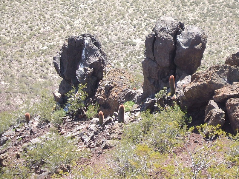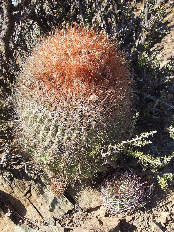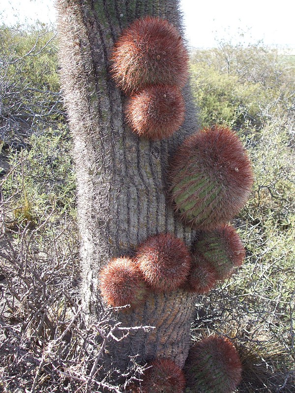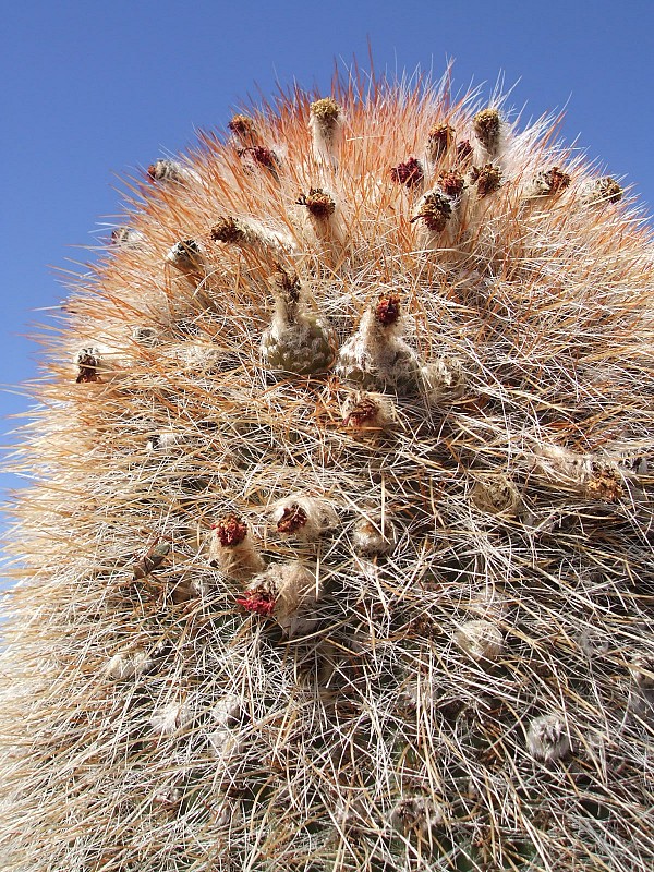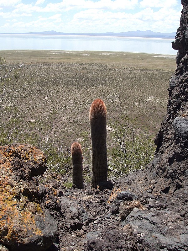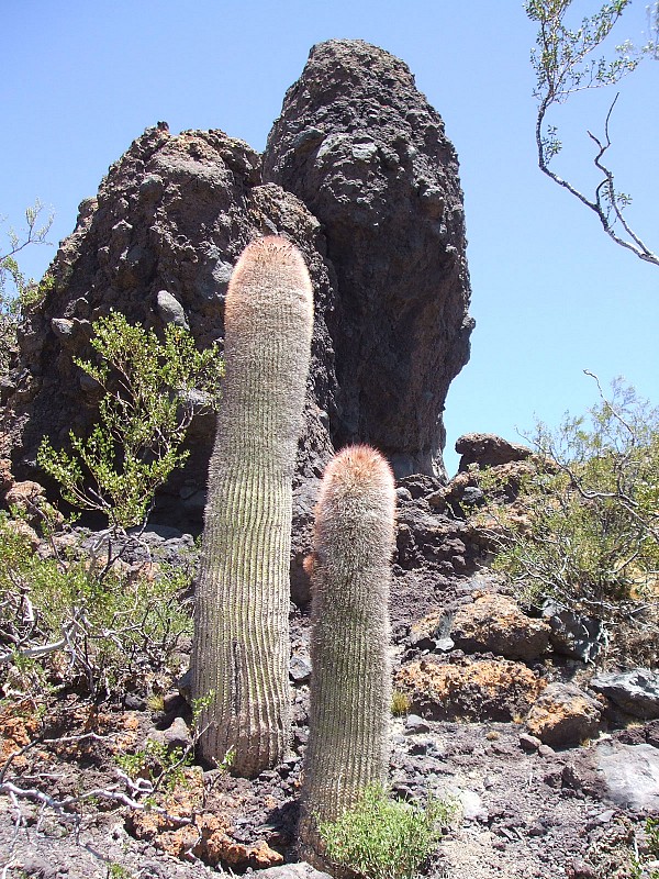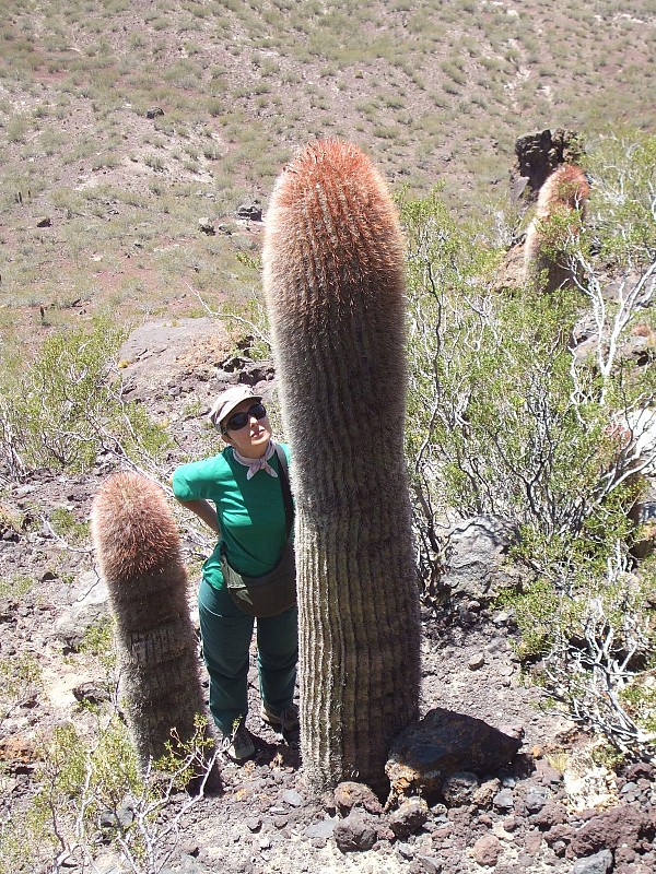 Denmoza rhodacantha (Salm - Dyck) Britton & Rose, solitamente può raggiungere il metro e mezzo in altezza, i 30 cm di diametro o più, ed avere, in vecchie piante, fino a 50 coste; è segnalato inoltre che vicino a Cacheuta (Mendoza, Argentina) arriva a 3 m di altezza con polloni alla base (Hunt et al. 2006, text: 74). All’interno della R. P. Laguna LLancanelo, nel dipartimento di Malargüe, il dipartimento più meridionale della provincia di Mendoza, abbiamo documentato 8 esemplari di notevoli dimensioni, tra i quali il più alto arriva a m 3,15 (foto 26 e 27), ed il più largo conta 52 coste e 48 cm di diametro (foto 13); in due casi le piante hanno prodotto polloni dalla base e dal fusto (foto 26-30). (Ottobre 2010)